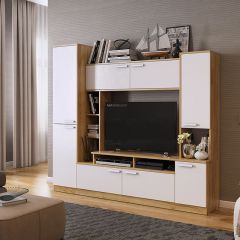 Состоит из: открытых полок, закрытых полок, ниши под телевизор.