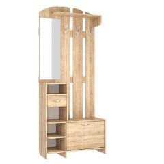 Состоит из: полок, вешалки с крючками для одежды и сумок, обувницы, открытых полок, зеркала, полки для головных уборов, выдвижного ящика. Сборка универсальная.